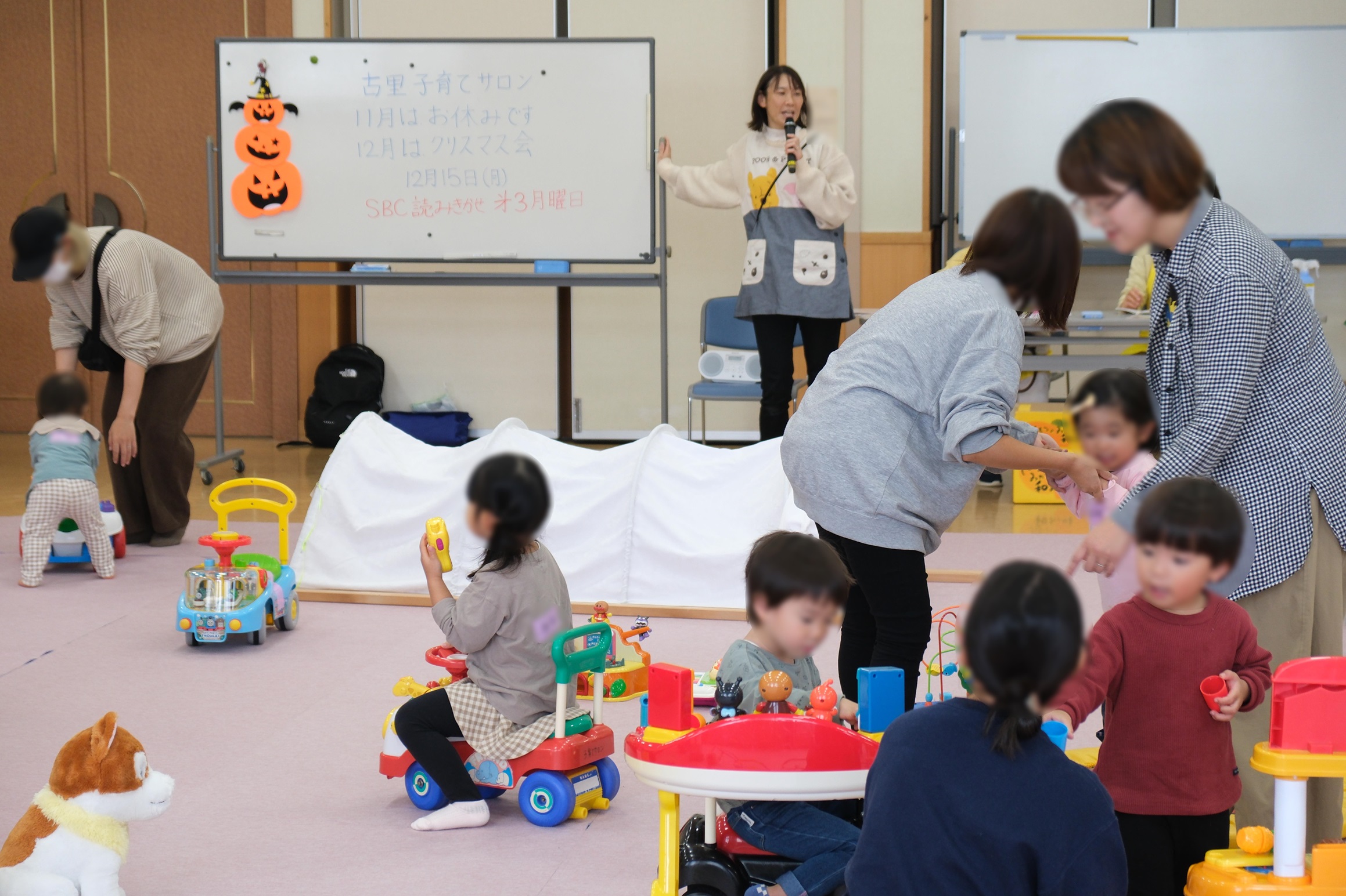 | 詳細: | 10月の子育てサロン開催いたしました。 ・日 時 10月27日(月) ・場 所 古里総合市民センター 多目的ホール ・参加者数 20組の親子 お子さんは25名(古里地区在住の親子) 当日は、天候も良く沢山の親子の皆様に来ていたき、ありがとうございました。 ハロウィン間近!、ハロウィンの飾り付けなどをして華やかで賑やかな会となりました。子どもたちは元気いっぱい走ったり、思い思いの遊具で遊んだり出来ました。 今回のおやつは、ハロウィンにちなんで、民生委員さんのお宅で育てたかぼちゃで茶巾絞りを手作りし、これもまた民生委員さんのお宅で育てた美味しいりんごを用意しました。栄養満点・愛情いっぱいのおやつ、楽しんでいただけたかと思います。 役員交代の時期でもあり、今回が現役員最後の会となりました。役員の3年間、皆様と力を合わせて子育てサロンが開催できました事、感謝の気持ちでいっぱいになりました。 11月はお休みして、12月から新しい役員体制で変わらず子育てサロンを開催します。 12月はクリスマス会を予定しています。アナウンサーによる読み聞かせと、クリスマスプレゼントとお土産のお菓子を用意する予定です。 12月第3月曜日、お待ちしていますのでお出かけください。 最後に、「毎回明るい雰囲気のサロンと手作りおやつ楽しみにしていました」とお母様から言われて嬉しかったです。ありがとうございました。 |
