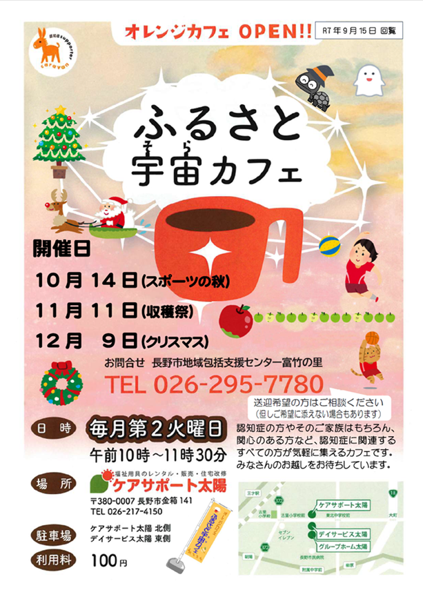 | 詳 細: | 名称:ふるさと宇宙(そら)カフェ 種別:認知症カフェ(オレンジカフェ) 開催日:毎月第2火曜日 10:00~11:30 場所:ケアサポート太陽(金箱) 参加費:100円/1人 事前申し込みは不要です。 但し、送迎希望の方は事前にご相談ください。 (連絡先は添付のちらしをご参照ください。) |
