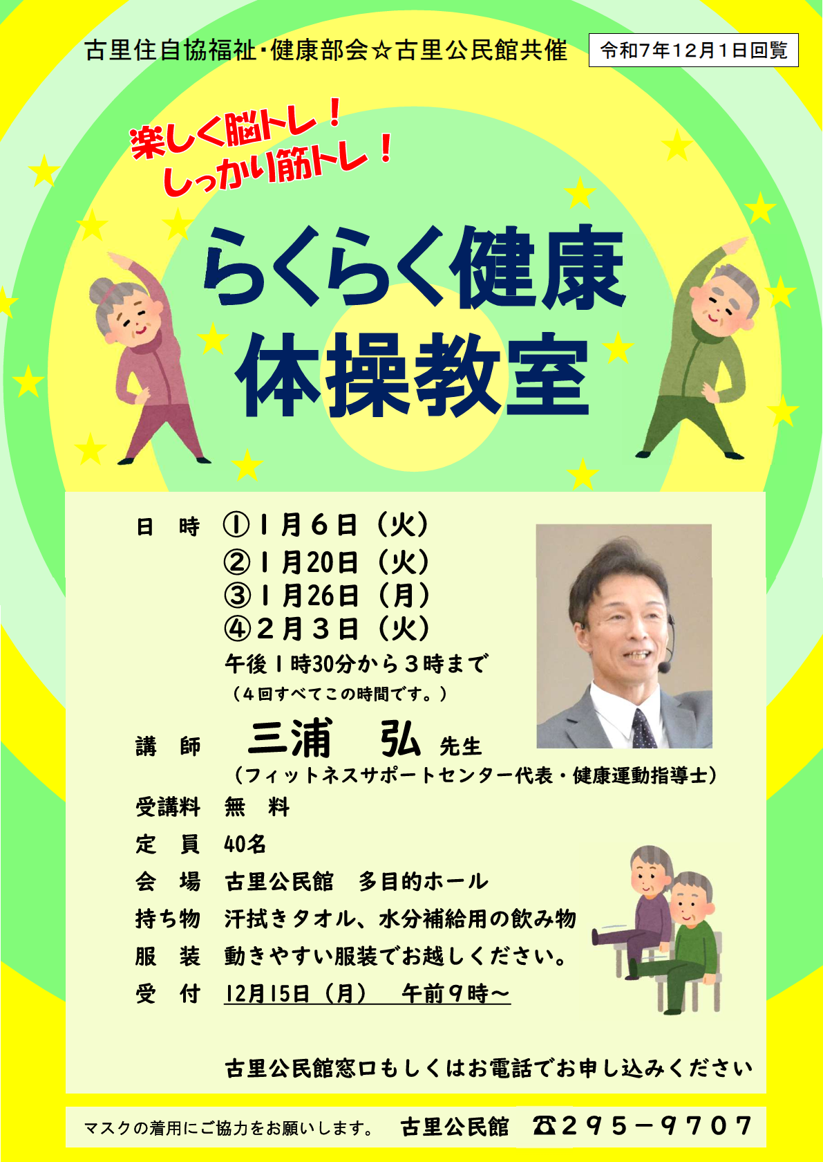 開 催 日:2026-01-06 掲 載 日:2025-11-20 福祉健康部会 古里公民館| 詳 細: | 「らくらく健康体操教室」を開催します。楽しく脳トレ!しっかり筋トレ!を実施しましょう。 日 時 ①1月 6日(火) ②1月20日(火) ③1月26日(月) ④2月 3日(火) 午後1時30分~3時(4回すべてこの時間です) 講 師 三浦 弘先生 (フィットネスサポートセンター代表・健康運動指導士) 受講料 無料 定 員 40名 会 場 古里総合市民センター 多目的ホール 持ち物 汗拭きタオル、水分補給用の飲み物 服 装 動きやすい服装でお越しください。 |